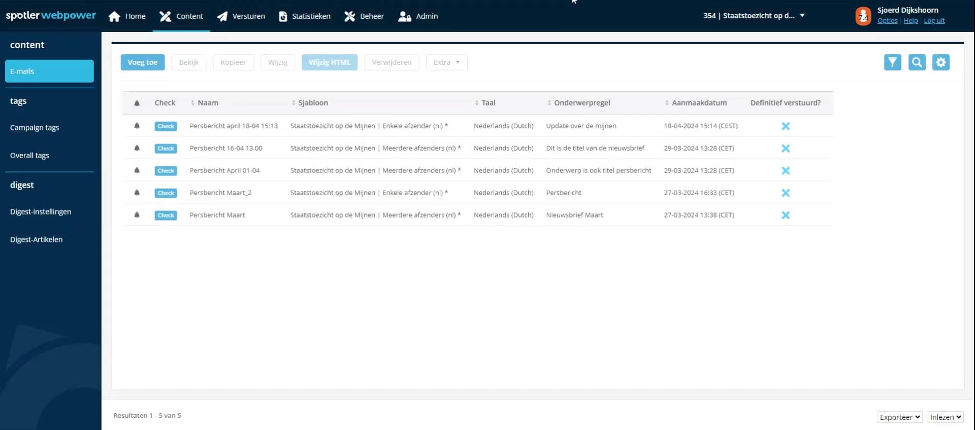 Hallo, in deze video laat ik je zien hoe je je persbericht kan testen. Een persbericht is een dynamisch bericht die alleen gestuurd wordt naar mensen die zich hebben ingeschreven voor die organisatie en voor het specifieke thema. Daarom werkt het testen altijd gepersonaliseerd. Wanneer ik een bericht hebt wat ik wil testen, klik ik op extra en vervolgens klik ik op snelversturen. Hier wordt automatisch mijn eigen e-mailadres toegevoegd en hier kan ik nog een collega aan toevoegen. Vervolgens moet ik gaan naar alternatieve contactvelden om hier een tag aan toe te geven. Boven in de campagnenaam zie je welke tag je moet gebruiken om dit te kunnen testen, dus in dit geval kies ik 354. Als ik dan op ok klik wordt de mail verzonden naar deze twee collega's. Indien ik dat vergeet of niet doe krijg ik ook de reactie dat die niet gestuurd kan worden omdat hij niet de ministeries of thema's heeft. Dit doe je door dat toe te voegen via het nummer. Op die manier kan je snel even naar jezelf sturen om te kijken hoe je bericht binnenkomt.