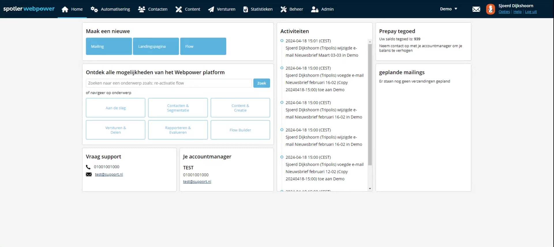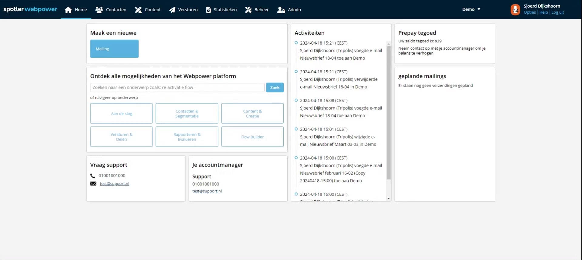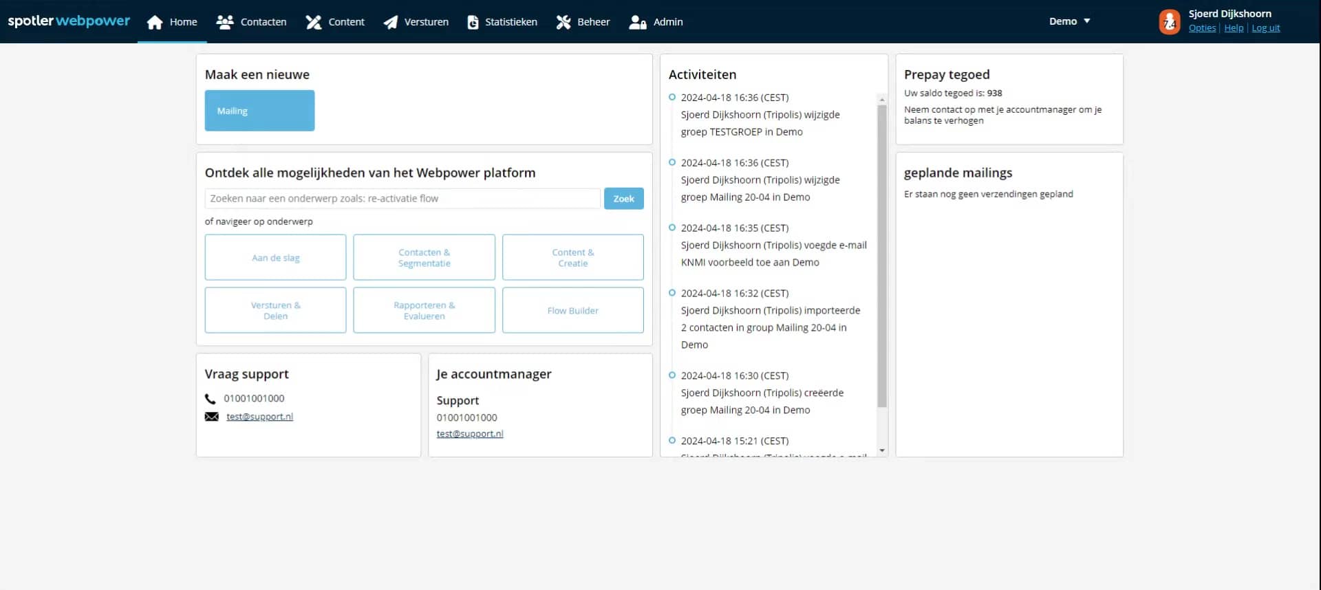 Je begint altijd op de homepagina. Dit is waar je aan de slag gaat en waar je ook de support en lijn ziet om je vragen eventueel te stellen. Vervolgens heb je de module contacten waarin je de contacten kan zien, je groepen kan aanmaken, je contacten kan exporteren en/of uploaden. Content, waar je je eigenlijk alleen begeeft in het tabje e-mails, waar je dus de berichten kan opmaken die je wilt gaan versturen. Het versturen, waar je de mailing kan inplannen om te gaan versturen naar de groep en de mail die je hebt gemaakt. En de statistieken, waar je hierzo alles vindt over de reeds verzonden mailings, denk aan kliks, denk aan opens, om te kijken hoe je mail wordt gelezen. Standaard heb je toegang tot de beheer en de admin module, maar ik zou adviseren om hier niet teveel tijd in te besteden, omdat dit met name is weggelegd voor de superusers.