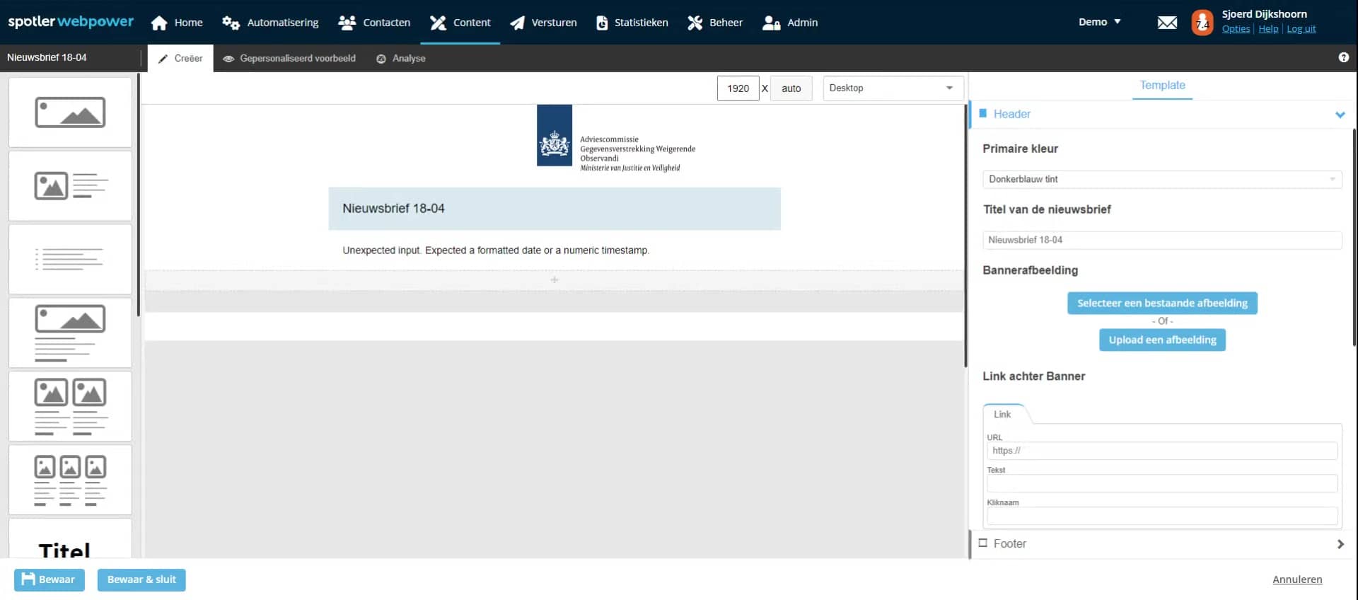 Welkom. In deze video ga ik je uitleggen hoe je je nieuwsbrief daadwerkelijk opstelt. Dus in de vorige video heb ik laten zien hoe je een bericht start en nu ga ik je laten zien hoe je hem content geeft. Daarvoor gaan we naar de module content, waar je de nieuwsbrieven ziet waar je nog aan werkt of die verstuurd zijn. En daar zie je het bericht wat ik net ben gestart. Wanneer ik daarop dubbel klik kom ik automatisch in de bewerkingsmodus. Daar zie je meteen dat automatisch de header wordt ingeladen, met het logo en het woordmerk van de campagne waar ik op dat moment in zit. Aan de rechterkant heb ik de mogelijkheid om de header styling toe te passen en de footer, en aan de linkerkant heb ik de mogelijkheid om blokken toe te voegen die uiteindelijk body geven aan mijn bericht.