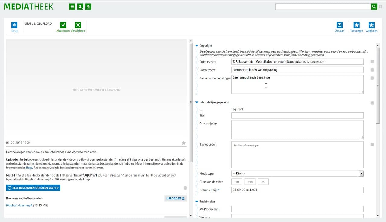 Goedkeuren heet in de Mediatheek Vrijgeven, omdat het media-item daarmee beschikbaar komt voor bezoekers. Pas zodra een media-item door een beeldmaker is klaargezet, kan het media-item met deze status bekeken en beoordeeld worden. Ook de meegegeven metadata kan gecontroleerd worden. Dit is erg belangrijk, omdat je als mediabeheerder de verantwoordelijkheid draagt over het correct en volledig metadateren van media-items. Daarbij hoort ook het instellen van het veld ‘Rechten voor gebruik’ en bijvoorbeeld het controleren op aanwezigheid van quitclaims.